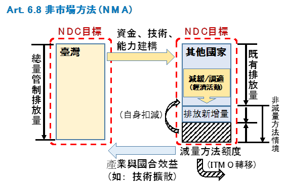 除上述之市場方法外,《巴黎協定》第 6 條第 8 項特別加入了所謂的非市場機制,如圖三所示,NMAs 係允許由一締約方提供資金、技術、能力建構予其他國家,協助該國進行減緩或調適活動,其因此產生之減量額度,則可被用於履行受援助國家之 NDC 義務,抑或成為該國投入 ITMOs 交易市場之額度。與上述市場機制不同之處在於,提供資金、技術、能力建構的投資方,並不能直接取得或掌握減碳成果,僅能獲得技術擴散、產業發展與國際合作之效益。 就此,其立意雖佳,然目前有部分開發中國家正呼籲此種計畫之執行應採用全球生命週期方法(global lifecycle approach)來實施,以避免有些國家將停止使用的設備再轉售給開發中國家。10