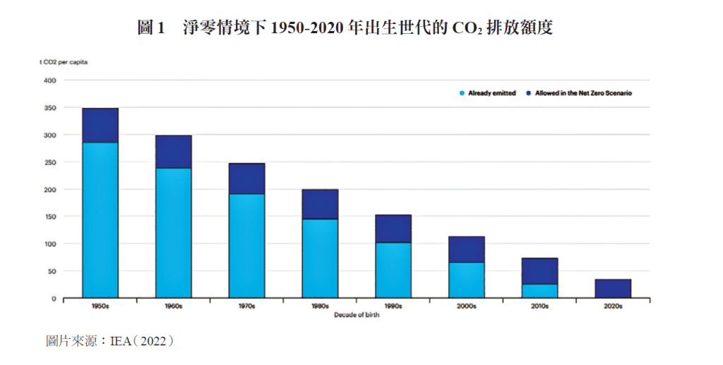 另方面,從世界淨零目標下碳足跡的世代差異來看,根據國際能源署(International Energy Agency, IEA)估算,出生於1950年代的人,平均個人終生碳排放額度約有350噸;相較之下,2020年代誕生的孩子,其終生的碳排放額度卻僅剩下34噸(圖1)。綜合上述評析,誕生於2020年後的孩童,不僅比起他們的祖父母們擁有更少的排碳額度,此外還需承擔更多且嚴峻的氣候災害。4