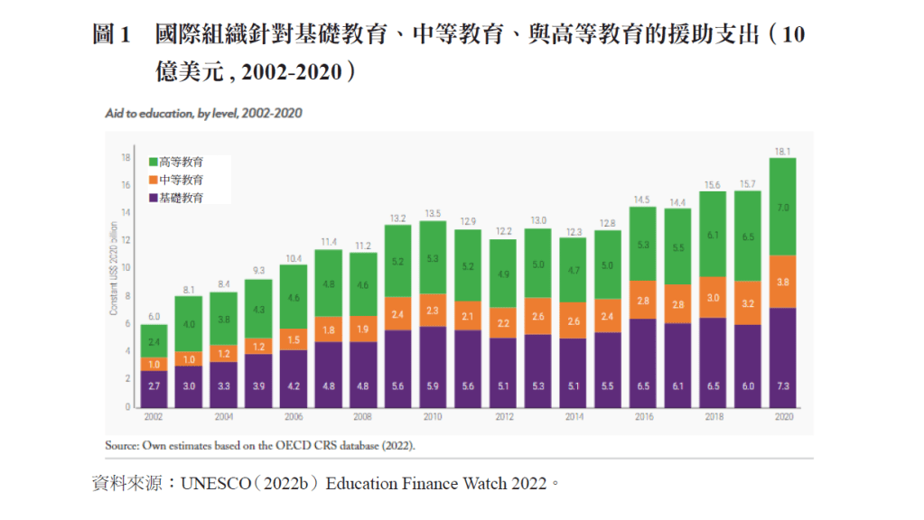 UNESCO每年皆會出版教育相關的報告,例如 《全球教育監測報告》(Global Education Monitoring Report, GEM Report),供有興趣的機關團體參考以制訂較佳的教育政策,亦針對不同議題分別進行探討,例如私立學校的影響、性別議題、財務投資(The Education Finance Watch, EFW)等專題報告。這些報告通常具有客觀的數據分析,除運用UNESCO本身數據中心聯合國教科文組織統計研究所(UNESCO Institute for Statistics, UIS)的資料外,亦會參考世界銀行(World Bank)、國際貨幣基金組織(International Monetary Fund , IMF)及經濟合作暨發展組織(Organisation for Economic Cooperation and Development, OECD)等國際組織的資料,對於全球的教育發展提供了客觀全盤的瞭解。圖1顯示,3 2002年至2020年間,國際組織針對基礎、中等、高等教育的投資趨勢。整體而言,18年來國際組織資助教育的金額不斷提高,投資於基礎教育和高等教育的經費大致相當。
