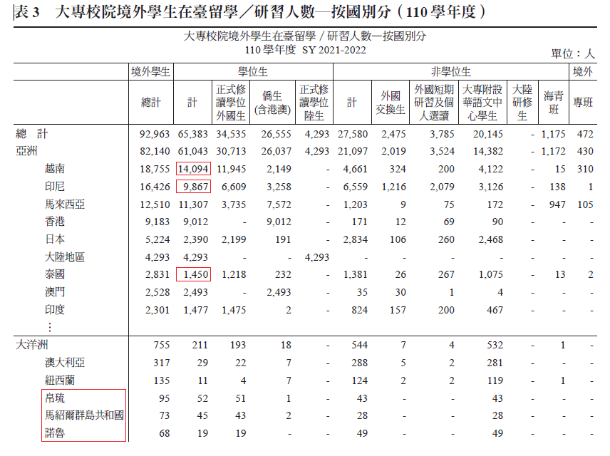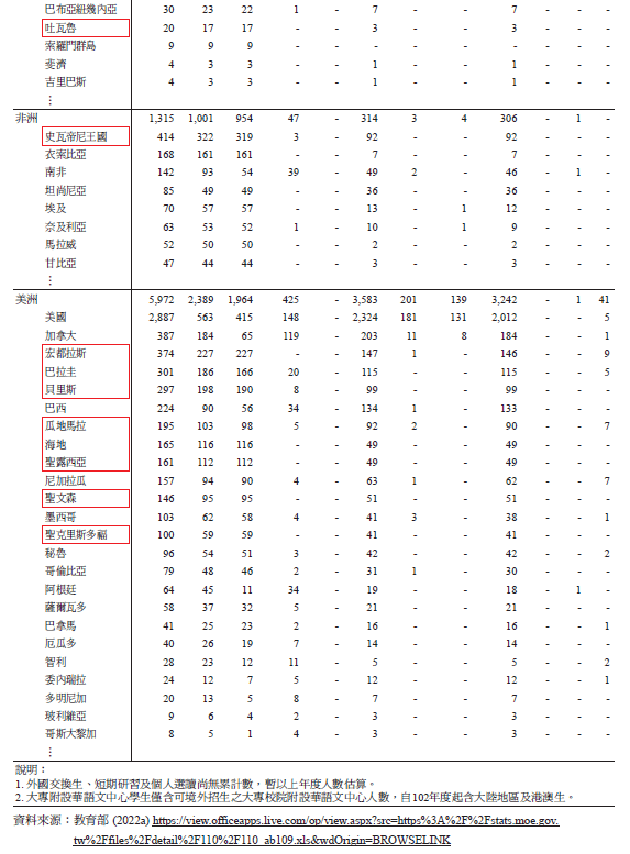 13 教育部(2022a),「境外學生在台留學人數(2021-2022)」,瀏覽日期2022年9月2日,https://view.officeapps.live.com/op/view.aspx?src=https%3A%2F%2Fstats.moe.gov.tw%2Ffiles%2Fdetail%2F110%2F110_ab109.xls&wdOrigin=BROWSELINK