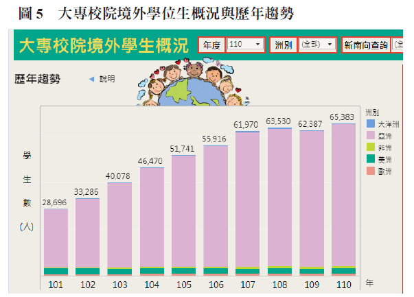 12 教育部(2022b),「大專校院境外生歷年趨勢」,瀏覽日期2022年9月3日,https://stats.moe.gov.tw/statedu/chart.aspx?pvalue=36