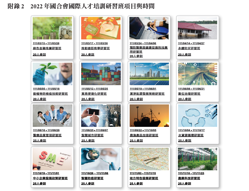 此計畫以「協助友邦及友好開發中國家培育經濟、社會發展所需之政策規劃與相關領域專業人才」為宗旨,各班研習主題呼應聯合國「永續發展目標」及世界援助潮流,針對友邦與友好國家發展需求與臺灣優勢強項,辦理農業、中小企業、公衛醫療、資通訊及環境教育等相關領域研習班。17 自1997年迄今,已辦理約410梯次專業研習班,共計逾9,511名政府官員來臺參訓。182022年規劃的16項專業研習班,如附錄2。19