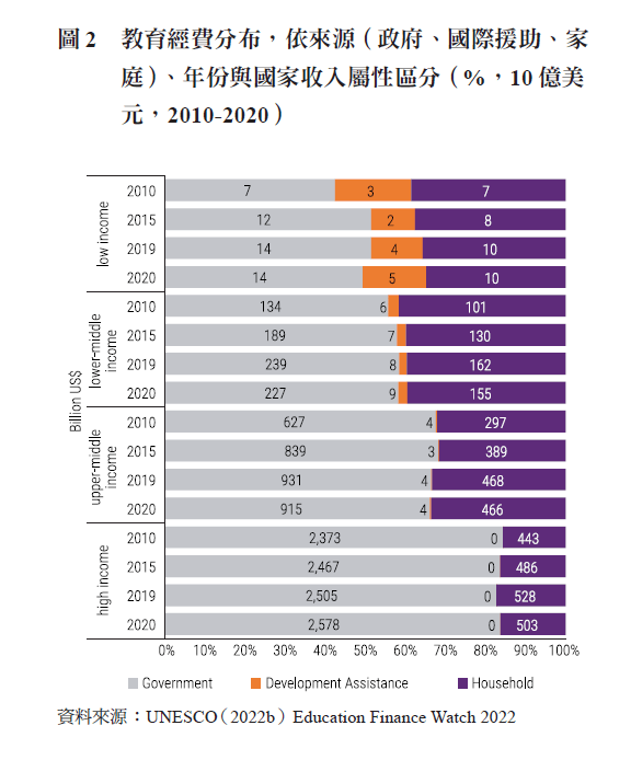 圖2則顯示,4 低收入國家政府於教育的投資少於整體總經費之一半。雖然投資於低收入國家教育的比率較高(見橘色區塊),但以投資金額而言,國際組織援助中低收入國家的金額,如橘色區塊之6、7、8、9,高於低收入國家的3、2、4、5(單位為10億美元)。另根據圖2所示,2010年至2020年間,國際組織每年補助低收入、中低收入與中高收入國家教育經費平均約59億美元。