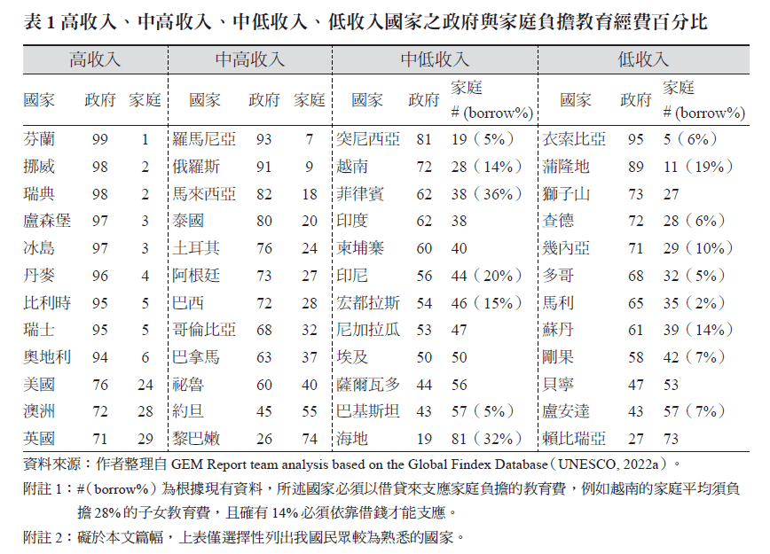 為了深入瞭解各國政府與其國內家庭各負擔多少比例的教育經費,本文特別整理列表(如表1),5 選擇性列出一些我國民眾較為熟悉的國家。高收入國家中,北歐與西歐小國的政府均負擔大部分的教育支出,英國則為71%;中高收入國家如羅馬尼亞與俄羅斯,其政府亦負擔91% 以上的教育經費;中低收入國家整體而言,政府分攤的教育經費比前兩類國家低,但如突尼西亞與越南,其政府仍負擔72%以上的教育支出。至於低收入國家,從表1中可發現衣索比亞係由政府負擔95%的教育經費,其比例遠比中高收入與中低收入國家還多,且從整體來看,低收入國家負擔教育經費的百分比,並不見得會比中低收入國家少。然而,問題的關鍵在於,許多中低與低收入家庭必須透過借貸,方能支付孩子的教育費用,例如越南14%,菲律賓36%及蘇丹14%等。
