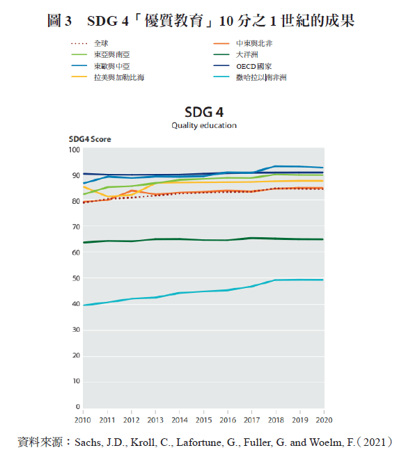 綜上,國際組織每年補助開發中國家許多教育經費,到底有無成效?摘自《2021 年永續發展報告》(Sustainable Development Report 2021)的內容,圖3顯示,6 在2010 年至2020年間,非洲國家於提供優質教育方面有大幅的提升,東亞與南亞、東歐與中亞也有不錯的成果,而拉丁美洲自2014年起,便無太大的成長,至於大洋洲則只有非常微小的提升。此外,近年由於COVID-19疫情與俄烏戰爭的爆發,影響了國際組織之經費分配與許多國家對於教育的投資。縱使隨著疫情逐漸趨緩,高收入國家於教育的支出已然恢復疫情前水準,然而低收入且學生學習效果不佳的國家卻仍持續減少其教育支出。7 由此可見,欲達成2030年SDG 4「優質教育」的目標,仍有待努力。