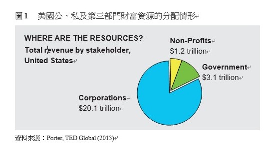 多年來,全球永續發展的問題,大多是由非營利組織(nonprofit organizations, NPOs)和非政府組織(nongovernmental organizations, NGOs)等進行處理。單由公部門負責解決永續發展問題,已被證明似乎太過美好而不切實際;各種統計數字也顯示,制式的國際發展援助計畫, 已經無法為貧困社區帶來繁榮的生活。2 經濟放緩,加上世界各地的環境和不平等問題,促使各界要求企業實施創新的永續商業策略,確保他們可以同時創造社會價值和股東價值,並與永續發展所欲達到的目標對齊。競爭力大師麥可波特(Michael Porter),在 2013 年一場介紹共用的價值(creating shared value, CSV)的 TED 演講中,更以數字強調私部門參與解決社會問題的必要性。他提到,在美國超過 8 成(82%)的財富掌握在私部門之中(圖 1),也因此協助解決社會問題及永續發展,是私部門責無旁貸的義務。